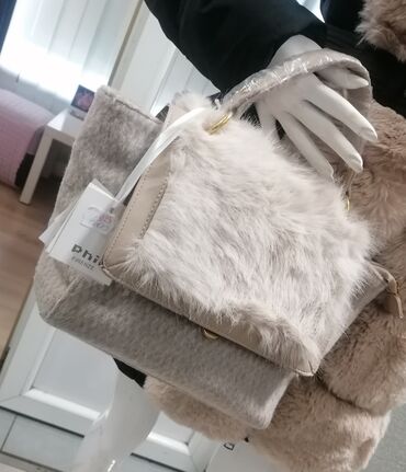 - Materijal: mekani tekstil/filc u svetlosivoj nijansi kombinovan sa veštačkim krznom u bež‑krem tonu; detalji od glatke eko‑kože