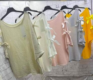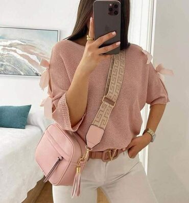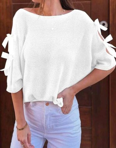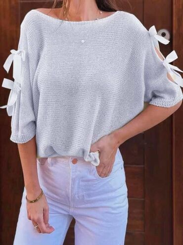 Lagana ženska pletena bluza u roze, beloj, sivoj ili žutoj boji, idealna za svakodnevno nošenje. Bluza ima širok okrugli izrez i kratke rukave. Poseban detalj su ukrasne mašne na ramenima koje dodaju ženstveni i elegantan izgled. Dizajn sa mašnama i pletenim radom čini je pogodnom za različite prilike, od opuštenih do nešto formalnijih. Prozračan materijal osigurava udobnost tokom celog dana.