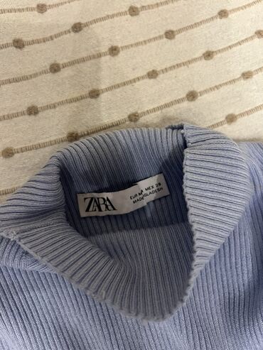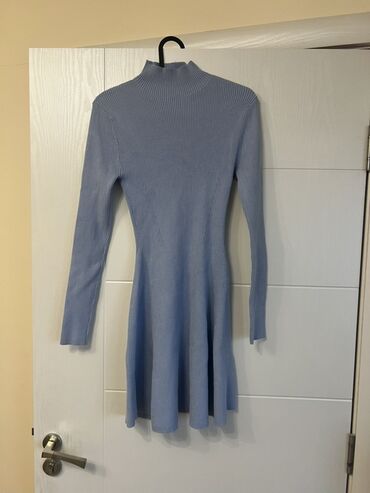 Zara pletena haljina sa dugim rukavima, svetloplave boje. Rebrasta tekstura, rastegljiv materijal koji prati liniju tela, blago A-kroja od struka nadole. Visoka kragna (polurolka) pruža dodatnu toplinu i elegantan izgled. Dužina do iznad kolena. Veličina na etiketi: EUR M (MEX 28). Proizvedeno u Bangladešu. Idealna za svakodnevne i večernje kombinacije; lako se uklapa uz čizme ili patike.