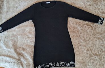 - Model 2: Crna, dugi rukavi, okrugli izrez. Diskretan sjaj tkanja. Bele cvetne aplikacije/vezeni detalji na manžetnama i duž donjeg poruba.