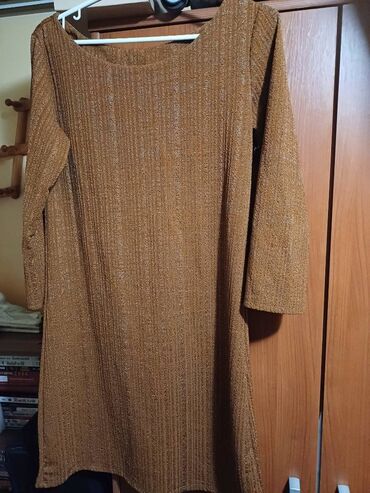 Žensko haljina/tunika u zlatno-braon boji sa sjajem. - Kroj: ravna silueta, dužina iznad kolena; 3/4 rukavi. - Izrez: širok okrugli izrez. - Materijal: rebrasti pleteni materijal sa diskretnim šlj...900 RSD