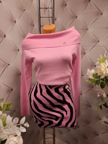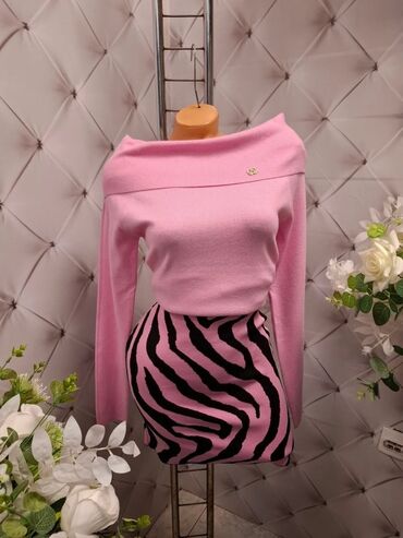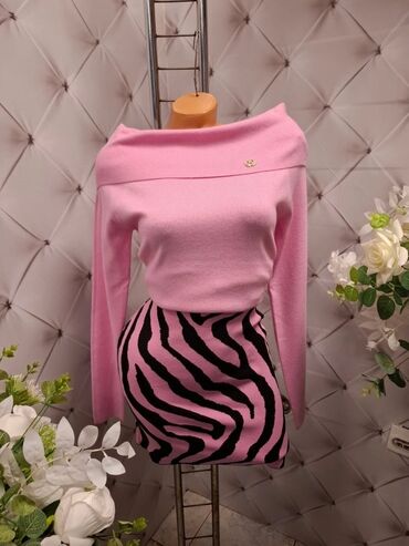 Ženski komplet – džemper i pantalonice od mekanog pletiva u jarkoj pink boji. - Gornji deo: rol-kragna, opušten kroj sa spuštenim ramenima, rebrasti ranfle na rukavima i donjem rubu, dekorativna m...