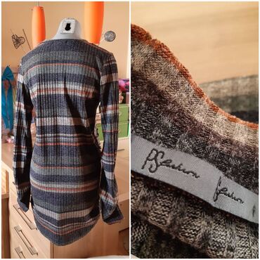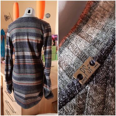 - Materijal: meka rebrasta pletenina, višebojne pruge (sive, teget, narandžaste nijanse)