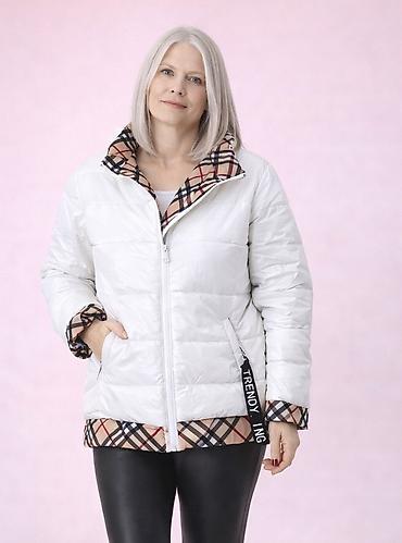 - Postava/detalji: kontrastna tartan (karirana) postava vidljiva na rukavima i donjoj ivici kada se podvrnu