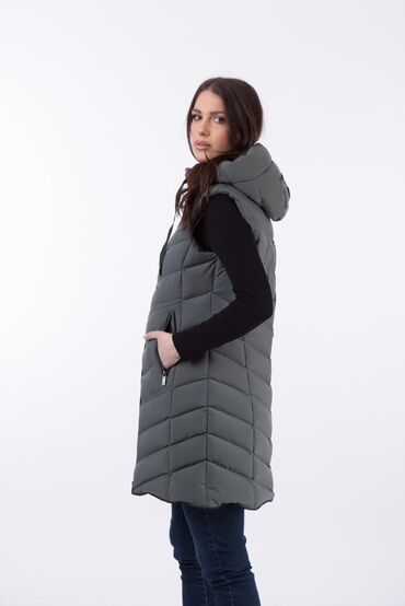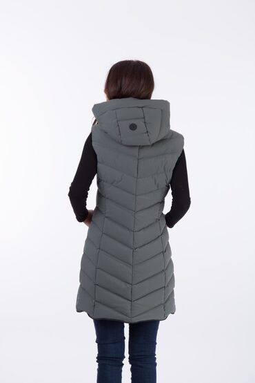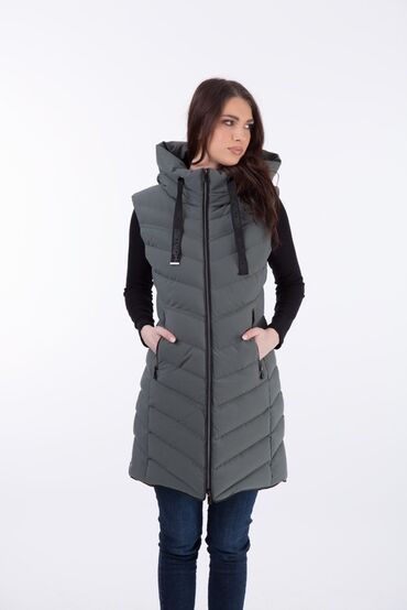 Ženska dugačka prošivena prsluk-haljina sa kapuljačom. - Model: dugi prsluk bez rukava, A-kroja, dužine do ispod kolena - Zatvaranje: prednji rajsferšlus po celoj dužini - Struk: podesivi učkur/ve...