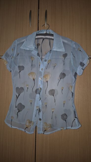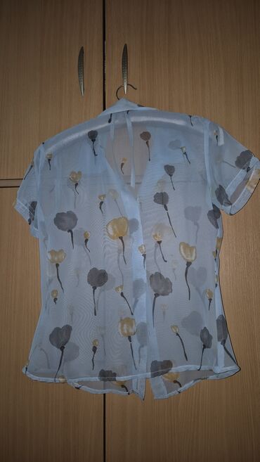 Providna ženska košulja kratkih rukava, svetloplave boje sa sitnim cvetnim printom u sivim i bež tonovima. Model je od lagane mrežaste/šifon tkanine, strukiranog kroja, sa klasičnom kragnom i kopčanjem na dugmad po sredini. Rub blago talasast, prozirna tekstura pogodna za nošenje preko topa ili majice. Dužina do kukova, kratki rukavi sa porubom. Idealna za letnje kombinacije, poslovno-kežual ili večernje slojevito stilizovanje.