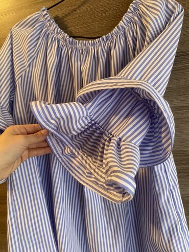 Plava-bela prugasta bluza sa širokim volan rukavima