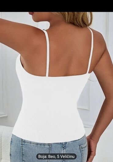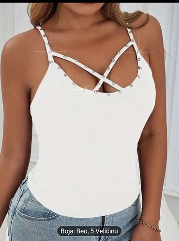 CirkoniBeli rebrasti kamisol top sa ukrštenim bretelama i detaljima od cirkona. Dizajniran je sa V-izrezom i tankim bretelama, pružajući elegantan izgled. Materijal je rebrast, što doprinosi teksturi i udobnosti. Idealan je za nošenje u različitim prilikama, lako se kombinuje sa farmerkama, suknjama ili pantalonama.