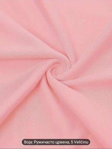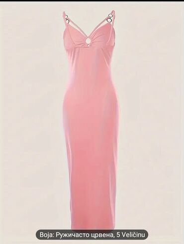 Uska ženska haljina u ružičasto crvenoj boji, dužine do lista. Dizajn karakterišu tanke bretele sa metalnim alkom, duboki izrez na grudima sa naborima i otvorom u obliku suze, kao i dubok šlic na jednoj strani. Izrađena je od rastegljivog materijala koji prati liniju tela. Pogodna za svečane prilike, večernje izlaske i letnje događaje.
