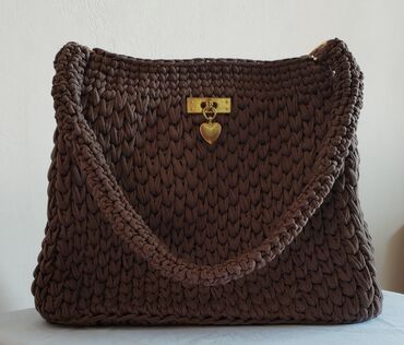 - Čokoladno braon prostraniji model sa heklanim kaišem i zlatnom kopčom.