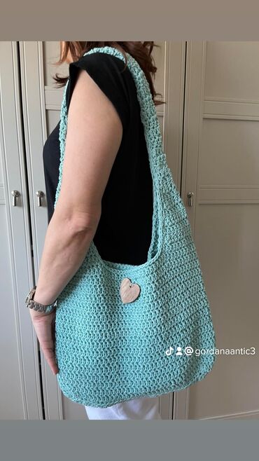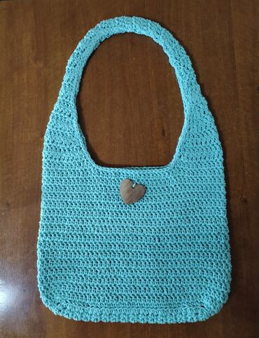 - Tirkizna “hobo” torba meke forme sa drvenim srcem kao detaljem.