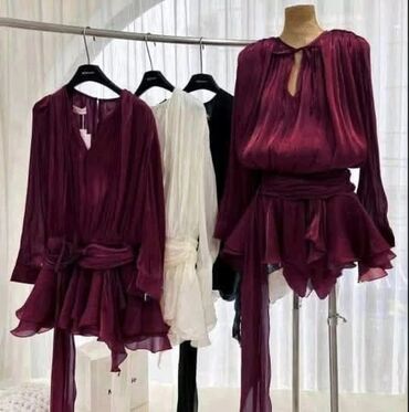- Lepršava šifon haljina/tunika sa bogatim volanima, širokim pojasom za vezivanje i bluzastim gornjim delom, u vinsko-crvenoj, beloj i crnoj varijanti.