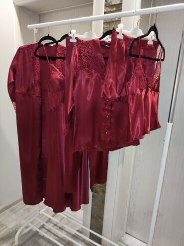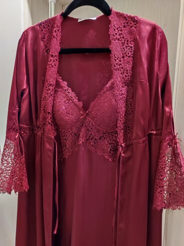 Elegantna ženska satenska spavaćica sa ogrtačem – bordo boja. - Dvoslojni set: kratka spavaćica i lagani kimono ogrtač - Sjajna satenska tkanina, meka na dodir - Dekolte i rukavi ukrašeni finom či...