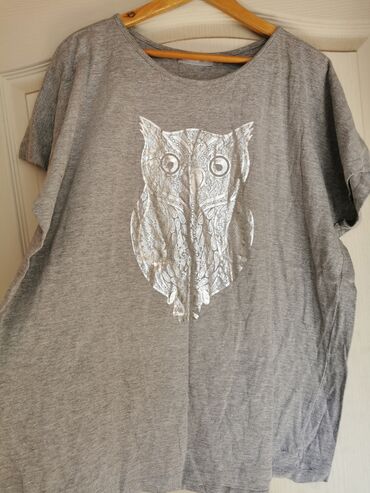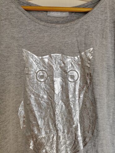 Drugi dekorSiva ženska majica Janina, veličina 48. Klasičan okrugli izrez i kratki rukavi. Na prednjoj strani je veliki sjajni (metalizirani) print sove sa detaljnim ornamentima u srebrnoj boji. Mekan, lagan pamučni dukserski/džersi materijal prijatan za svaki dan. Kroj je komotan i opušten, dužina preko kukova. Neutralna siva boja lako se kombinuje sa farmericama, helankama ili šortsem; srebrni motiv dodaje efektnu notu.