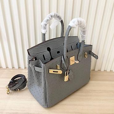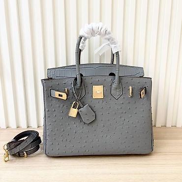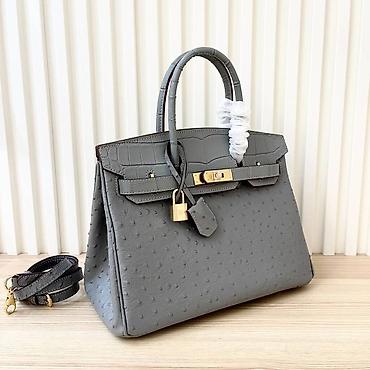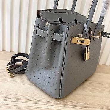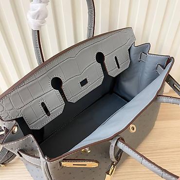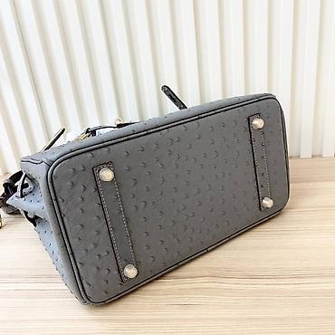 Siva ženska torba sa ručkama i odvojivim dugim kaišem. Model sa preklopom i metalnim okovom u zlatnoj boji (rotirajuća kopča, katancić i ključić u kožnom privešku). Gornji deo i ručke imaju reljefnu teksturu nalik krokodilskoj koži, dok je telo torbe od kože sa karakterističnim tačkastim reljefom nalik nojevini. Struktuisana silueta sa postraničnim preklopima i metalnim nožicama na dnu.