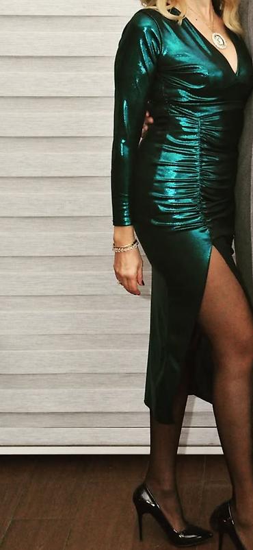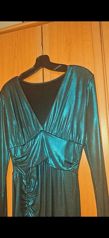 Haljina NOVA smaragdno‑zelena iz Italije svecana, vecernja, elegantna, sa slicem na desnoj strani, dugi rukavi, prati liniju tela, vrlo rastegljiva od poliestera/viskoze sa elastinom, V‑izrez, nabrana lepo oblikuju struk i sakriva stomak!