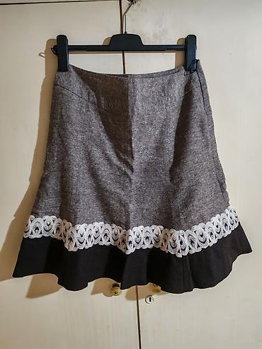 Klasična siva osnova sa crnim rubom i belom čipkom daje ženstven i prefinjen izgled, lako se uklapa uz košulje, rolke i čizme ili baletanke.