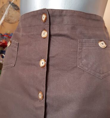 Suknja TECHNΟ, braon boje, A-kroja. Prednje kopčanje na niz okruglih dugmadi, sa dva mala prednja džepa ukrašena dugmetom. Visoki struk, ravnog poruba. Materijal je čvrst, prijatan na dodir (pamuk/twill izgled).