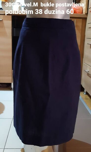 Tamno plava suknja od bukle tkanine, postavljena. Kroj klasičan, ravna suknja sa blagim strukom. Veličina M. Mere: poluobim struka 38 cm, dužina 60 cm. Materijal teksturisan (bukle) sa finom linijskom strukturom, prijatan i gušći, sa podstavom za udobno nošenje. Idealna za poslovne i svečane kombinacije.