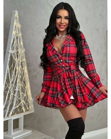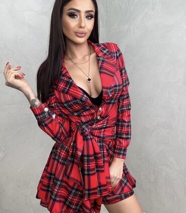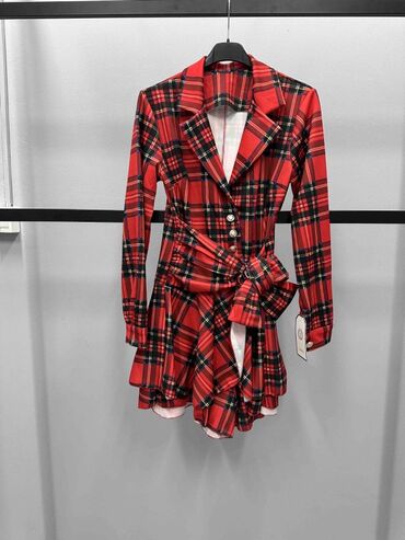 💥Ženska kratka haljina u kroju sakoa, u crveno‑crnom (kariranom) dezenu.