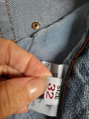 - Materijal: klasičan plavi denim sa narandžastim štepom i metalnim dugmetom/kopčanjem