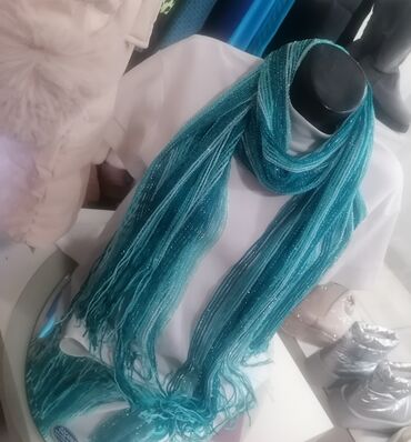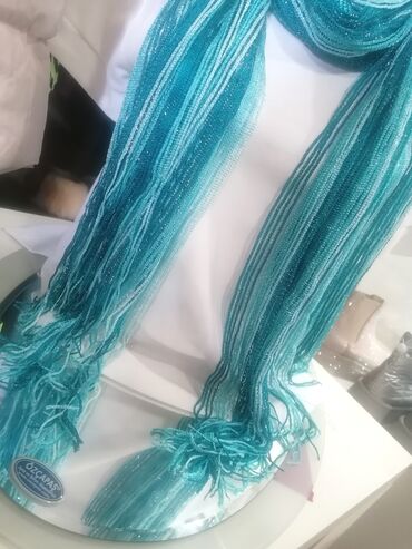 Elegantna ženska ešarpa/šal od tankih, lepršavih traka u nijansama tirkizne i svetloplave, sa diskretnim metalik sjajem. Višeslojni dizajn stvara efekat bogatog volumena, a duži resasti krajevi daju modni akcenat. Mekana i lagana, idealna za proleće/jesen ili kao dekorativni detalj tokom cele godine. Lako se kombinuje sa ležernim i svečanim odevnim kombinacijama; može se nositi oko vrata, prebačena preko ramena ili kao ukras na tašni. Dimenzije: dužina duga, uži format traka. Materijal: sintetičko vlakno sa sjajnim nitima. Boja: gradijent tirkiz–akvamarin.
