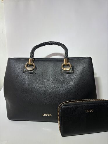 - Novčanik: crni, oko 19–20 cm dužine, pun obimni rajsferšlus, zlatni zip, LIU JO logo; unutra više odeljaka za kartice, novčanice i poseban pregradak sa rajsferšlusom za sitan novac