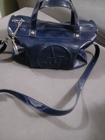 Torba za rameTorba AJ Armani Jeans – tamnoplava lak koža (sjajna), sa velikim reljefnim AJ logoom na prednjoj strani.