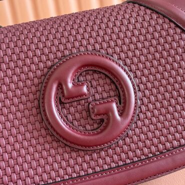 - Materijal: glatka prirodna koža u bordo nijansi, centralni deo sa reljefnim/pletenim efektom; veliki GG logo na prednjoj strani u ton boji.