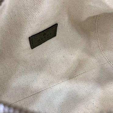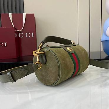 Zelena torba preko ramena od brušene kože sa prepoznatljivom zeleno-crvenom prugom i metalnim GG detaljem na prednjoj strani. Kompaktna cilindrična forma, gornje zatvaranje metalnim rajsferšlusom sa zlatnim klizačem, kožni gornji ručnik i dugačak podesivi/removabilni kaiš za nošenje preko ramena ili crossbody. Metalne kopče i prstenovi u zlatnoj završnoj obradi. Unutrašnjost je od svetlog tekstila sa ušivenom kožnom etiketom i jednom kliznom pregradom/džepom sa strane. Idealna za svakodnevne potrepštine (telefon, novčanik, ključevi, šminka). Elegantna i praktična, uklapa se uz casual i chic kombinacije.