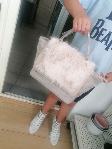 - Materijal: mekani tekstil u svetlosivoj/bež nijansi; prednji poklopac obložen veštačkim krznom u krem tonu; detalji od bež eko kože