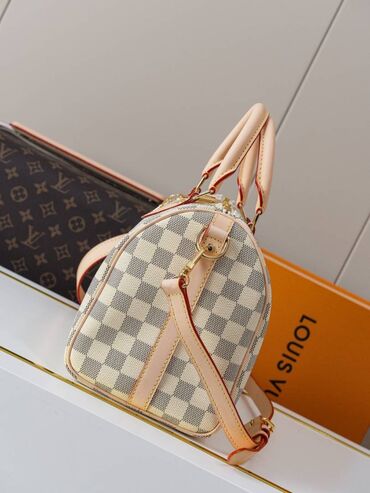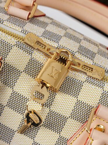 - Materijal: prepoznatljiv karirani platneni kanvas u svetloj nijansi (Damier-izgled) sa kožnim detaljima u prirodnoj bež boji i kontrastnim crvenim rubom.