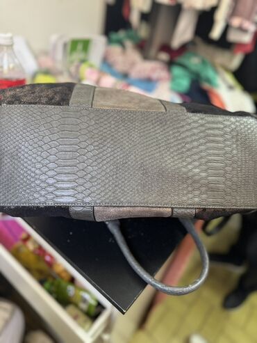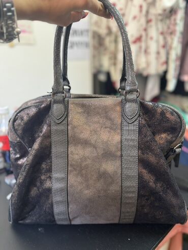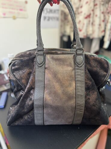 Velika ženska torba za rame/ruku u nijansama tamno braon i sive, sa blagim metalik odsjajem.