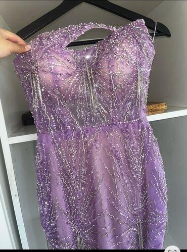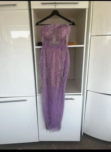 Luksuzna večernja haljina u pastelno‑ljubičastoj boji, duga silueta (do poda), bez naramenica. Gornji deo sa korsetskim oblikovanjem i diskretnim prozirnim panelima naglašava struk. Tkanina je bogato ukrašena ručno našivenim perlicama, kristalima i lancima sa sjajnim resicama koje padaju vertikalno preko bust dela i duž suknje. Šara perli formira razgranate, talasaste linije koje pružaju 3D efekat i visok sjaj pod svetlom.