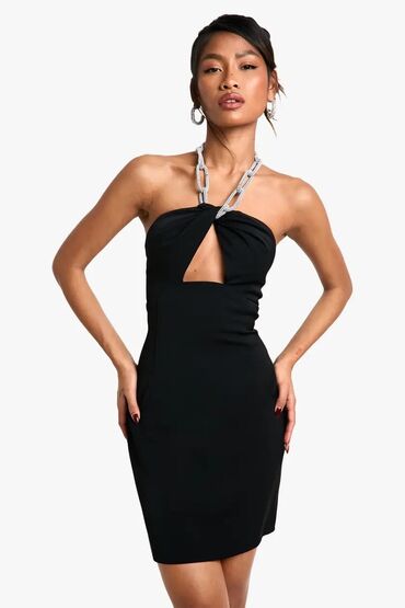 - Bretele: oko vrata sa dekorativnim, sjajnim lancem/karikama koje formiraju halter i daju glamurozan akcenat.