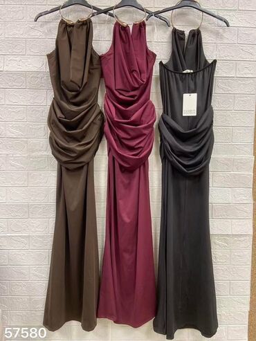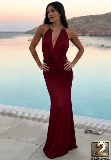 Elegantna večernja haljina sa metalnim prstenovima na vratu i dubokim drape dekolteom. Model je dugačak, prati liniju tela i blago se širi ka dnu. U predelu struka i kukova nalazi se izraženo naboravanje koje vizuelno ističe siluetu i daje sofisticiran pad materijala. Leđa su delimično otkrivena, sa istim prstenastim detaljima kao na prednjoj strani.