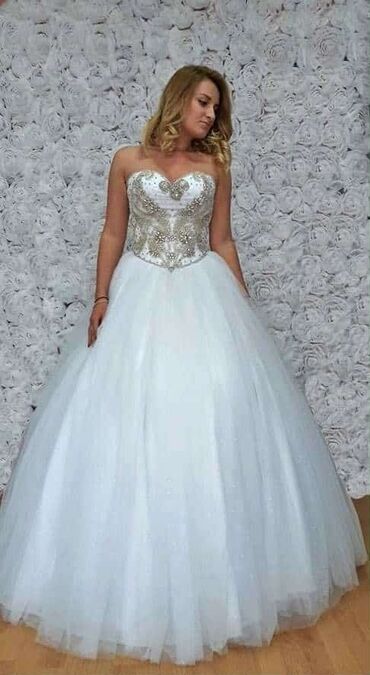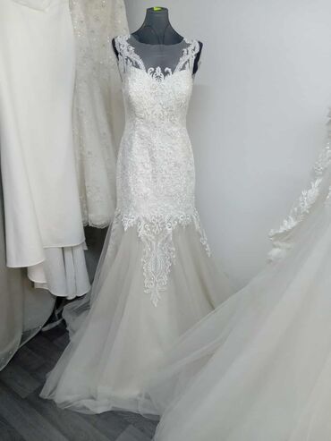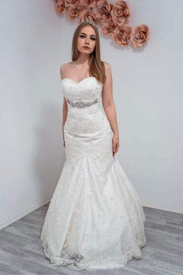Venčanica – sirena kroj sa šlepom i velom - Model: elegantna sirena/fit-and-flare linija koja prati figuru i blago se širi od kolena, sa dugim šlepom. - Gornji deo: bez bretela (strapless), čvrsto...