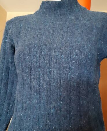VunaPletena ženska rolka od vune, tamnoplave melirane boje. Ravan kroj sa uskim rebrastim dezenom i visokom kragnom; dugi rukavi. Elastična i topla, prijanja uz telo.