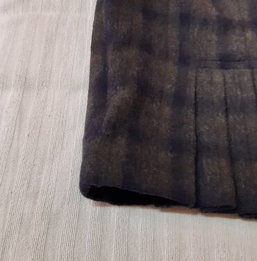 VunaVunena suknja, kockasti dezen u tamnim tonovima, postavljena. Model sa ravnim krojem i plisiranim detaljem pri dnu. Veličina S. Mere: poluobim struka 36 cm, dužina 56 cm. Cena: 300 RSD.