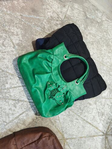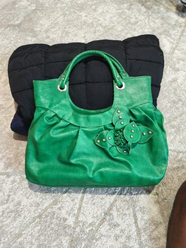 Torba za rameZelena damska torba sa ručkama za nošenje u ruci ili na ramenu. Materijal: veštačka koža sa blagim reljefnim efektom. Dekorativni detalj: velika aplikacija u obliku cveta sa metalnim nitnama i ukrasnim šavovima na prednjoj strani. Gornji deo sa metalnim ringlama kroz koje prolaze ručke, za dodatnu čvrstinu.