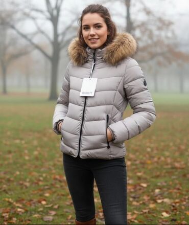 Napomena: Fotografije prikazuju realan izgled, uključujući teksturu materijala, sjaj tkanine i boju krzna na kapuljači.