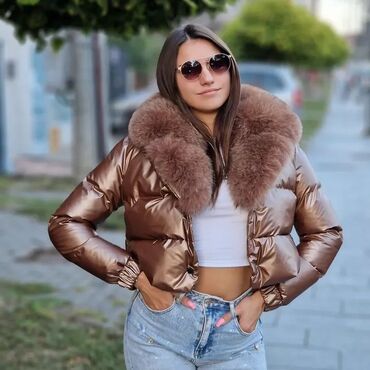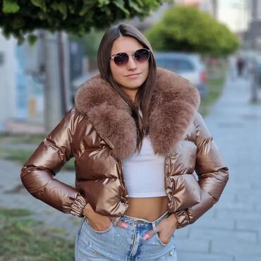 Kratka ženska zimska jakna u metalik bronzanoj boji sa raskošnim, voluminoznim krznenim kragnom/okovratnikom. Puf kroj sa horizontalnim prošivima pruža dodatnu toplotu i modernu siluetu. Model je krojen do struka, blago “boxy”, sa elastičnim manžetnama na rukavima i podesivom učkicom/vezurom u donjem rubu za bolje prijanjanje. Centralno kopčanje skrivenim rajsferšlusom i drukerima. Glatka, sjajna spoljašnjost otporna na vetar, prijatna postava iznutra. Savršena za svakodnevne zimske kombinacije, lako se uklapa uz farmerke i čizme. Boja: bronzana; krzno u toploj braon nijansi. Dizajn naglašava struk i daje luksuzan izgled uz visoku zaštitu od hladnoće. Idealna za gradske i večernje prilike.