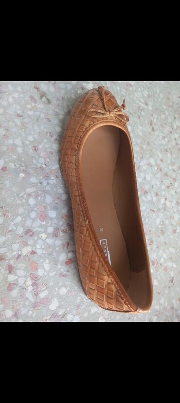 MNG (Mango) baletanke u tirkizno/plavoj boji sa mašnicom na vrhu. Lak kožni izgled (sjajna završnica), zaobljen vrh, plitak izrez, ravni đon. Oznaka broja 39, odgovara oko 38.5 prema meri. Unutrašn...