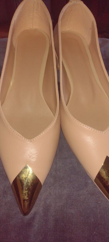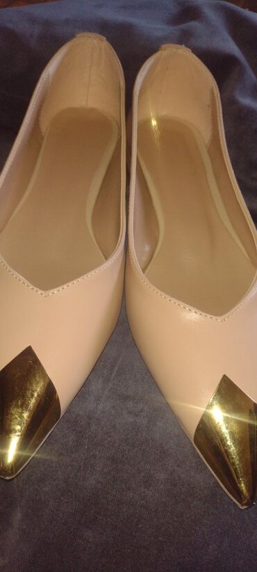 Elegantne ženske baletanke u bež/nuansama kože sa špicastim vrhom i metalik zlatnim kapicama na špicu.