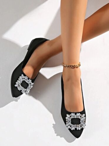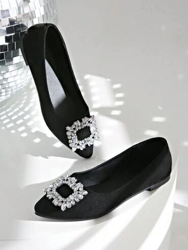 Elegantne baletanke sa ukrasnom kopčom - Model: ženske ravne cipele – baletanke sa špicastim vrhom - Boja: crna, satenski/sjajni finiš - Detalj: kvadratna aplikacija na vrhu ukrašena svetlucavim k...Veličina: