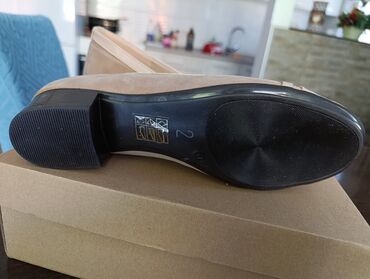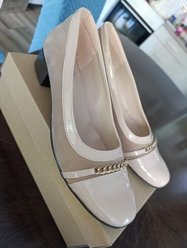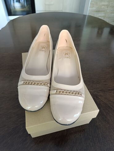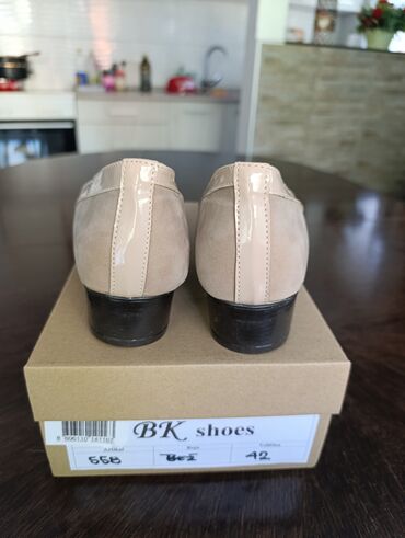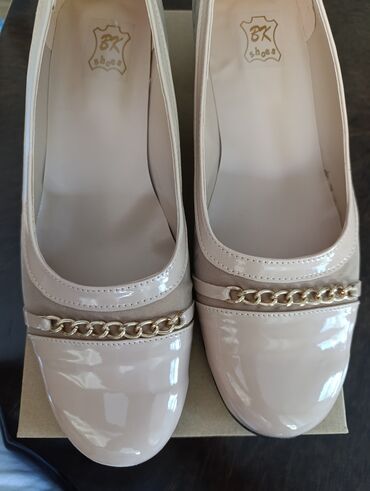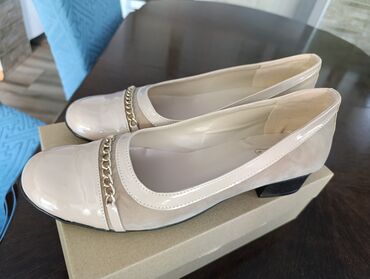 Drugi brendElegantne ženske baletanke/cipele na ravnu petu u bež nijansi sa lak (patent) završnicom. Na gornjem delu imaju dekorativan zlatni lanac i diskretnu traku, što im daje sofisticiran, klasičan izgled. Zaobljen vrh pruža udobnost tokom celodnevnog nošenja. Unutrašnjost je glatka, sa oznakom “BK shoes”. Đon je crn, gumeni, sa blagim podizanjem u peti radi stabilnosti. Model je idealan za poslovne kombinacije, svečanije prilike ili svakodnevni elegantan stil; lako se uklapa uz suknje, haljine i pantalone u neutralnim i pastelnim tonovima. Dolaze u kutiji.