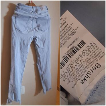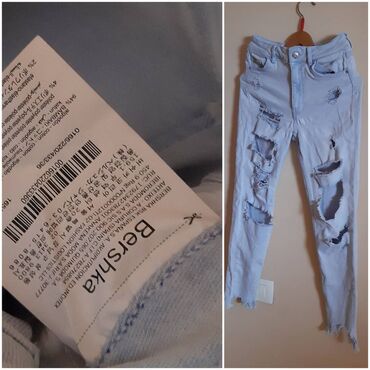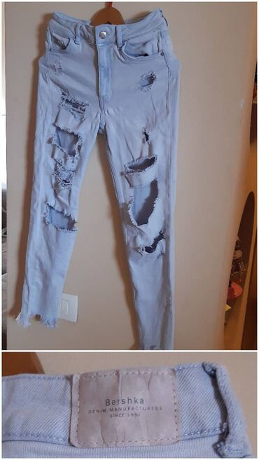 Bershka ženske farmerke – skinny, mid rise. Svetloplava isprana nijansa sa izraženim poderotinama napred i resama na nogavicama. Klasičan petodžepni kroj, rajsferšlus i metalno dugme, pojas sa petljama za kaiš. Veličina EUR 36 (USA 0, MEX 36). Dimenzije: dužina 88 cm, poluobim struka 29–36 cm, dubina napred 26 cm, pozadi 31 cm. Materijal prema etiketi: pamuk sa dodatkom elastina za rastezljivost. Cena naznačena na fotografiji: 400 rsd.