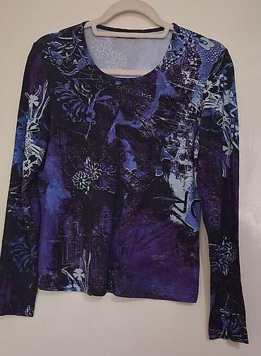 - Majica dugih rukava sa okruglim izrezom: elastična, lagana tkanina sa apstraktnim i cvetnim printom u nijansama ljubičaste, crne i plave. Ravnog kroja, prijatna za svakodnevno nošenje, lako se kombinuje uz farmerke ili suknju.