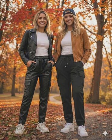 Ženske pantalone – 2 komada 1) Karamel/bež pantalone: - Uski kroj, dužina do članka - Dubok struk sa učkurom/pojasnom trakom na vezivanje - Asimetrično kopčanje sa vidljivim dugmićima napred - Dva...