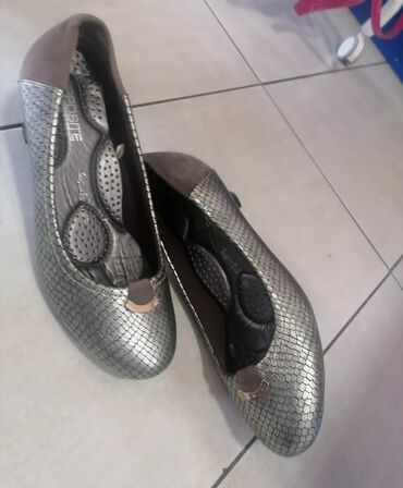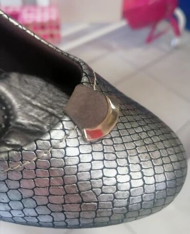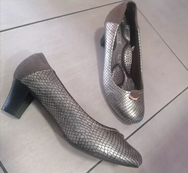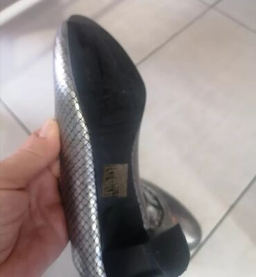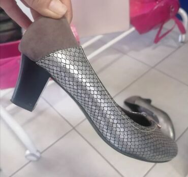Elegantne damske salonke u srebrnoj boji. - Model: klasične špic salonke sa srednje visokom potpeticom (tankom). - Veličina: 40 (oznaka na đonu). - Materijal gornjišta: sintetički (oznaka na đonu)....3 600 RSD